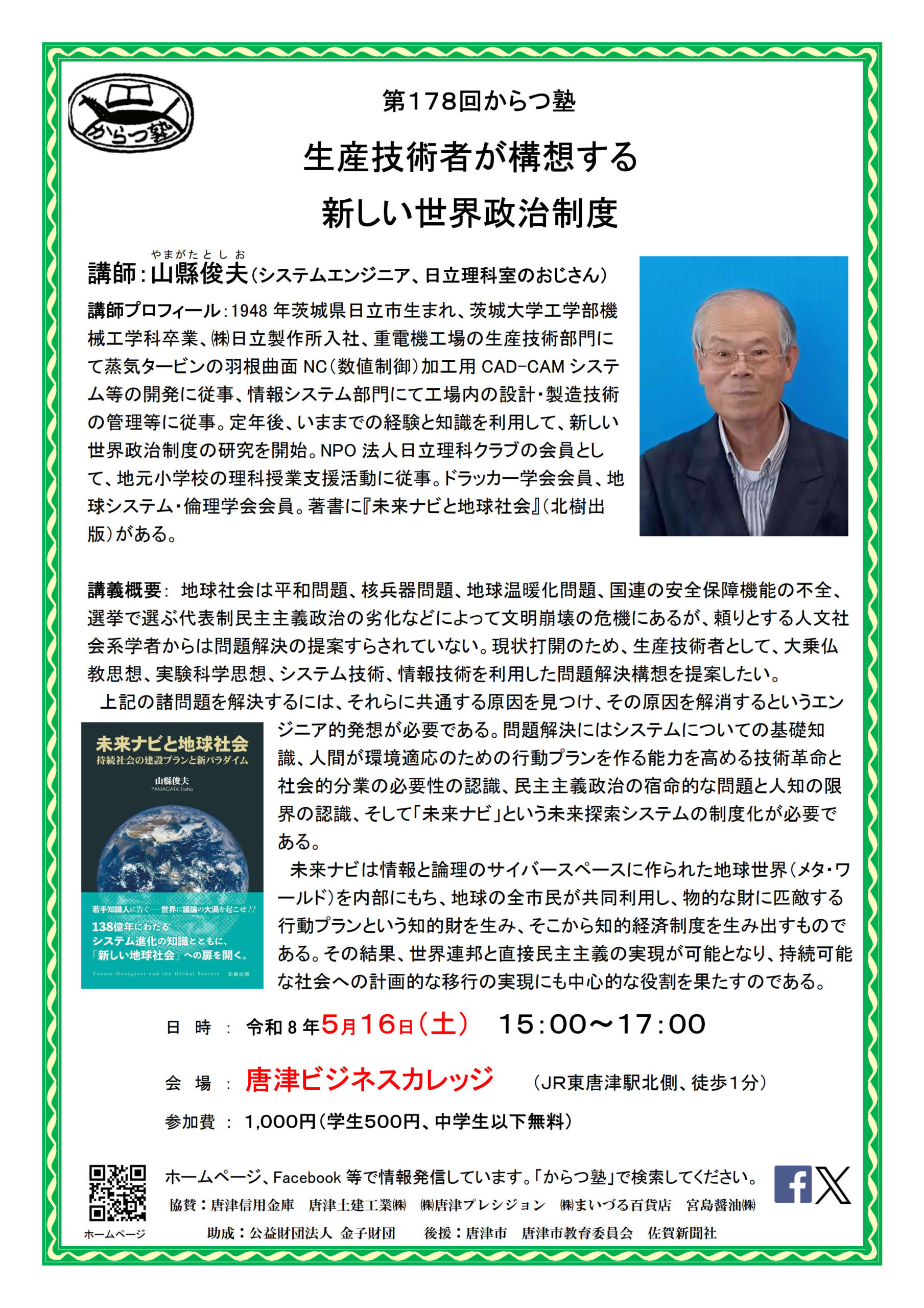 講師プロフィール:1948年茨城県日立市生まれ、茨城大学工学部機械工学科卒業、㈱日立製作所入社、重電機工場の生産技術部門にて蒸気タービンの羽根曲面NC(数値制御)加工用CAD-CAMシステム等の開発に従事、情報システム部門にて工場内の設計・製造技術の管理等に従事。定年後、いままでの経験と知識を利用して、新しい世界政治制度の研究を開始。NPO法人日立理科クラブの会員として、地元小学校の理科授業支援活動に従事。ドラッカー学会会員、地球システム・倫理学会会員。著書に『未来ナビと地球社会』(北樹出版)がある。